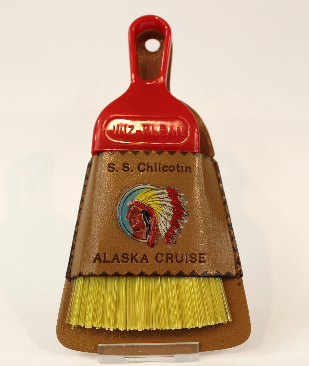 Plastic, souvenir butler brush and sleeve produced for the S.S. Chilcotin. Brush (b) with red plastic handle and yellow plastic bristles. In raised text on one side of handle, "WIZ-KLEAN." Top of handle is shaped in an oblong loop. Sleeve (c) of thin cardboard covered on one side with synthetic leather; sleeve is in the same shape as the brush. Top part of sleeve is stitched onto bottom with brown thread, and is decorated with impressed lettering "S.S. Chilcotin/ALASKA CRUISE" and an emblem of a Native American wearing a feathered headdress.