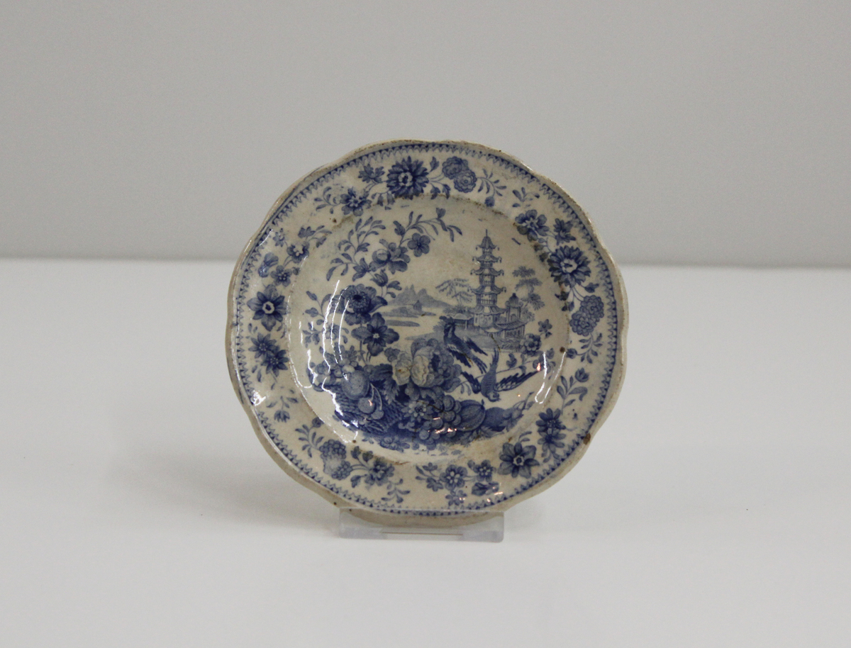 Glazed earthenware dish used as toy or play teaware. Off-white ceramic with blue transfer-printed decoration of floral motifs with Asian-inspired landscape, buildings, and birds. Floral border on rim with scalloped edge. Marked on bottom with small, four-petal flower.