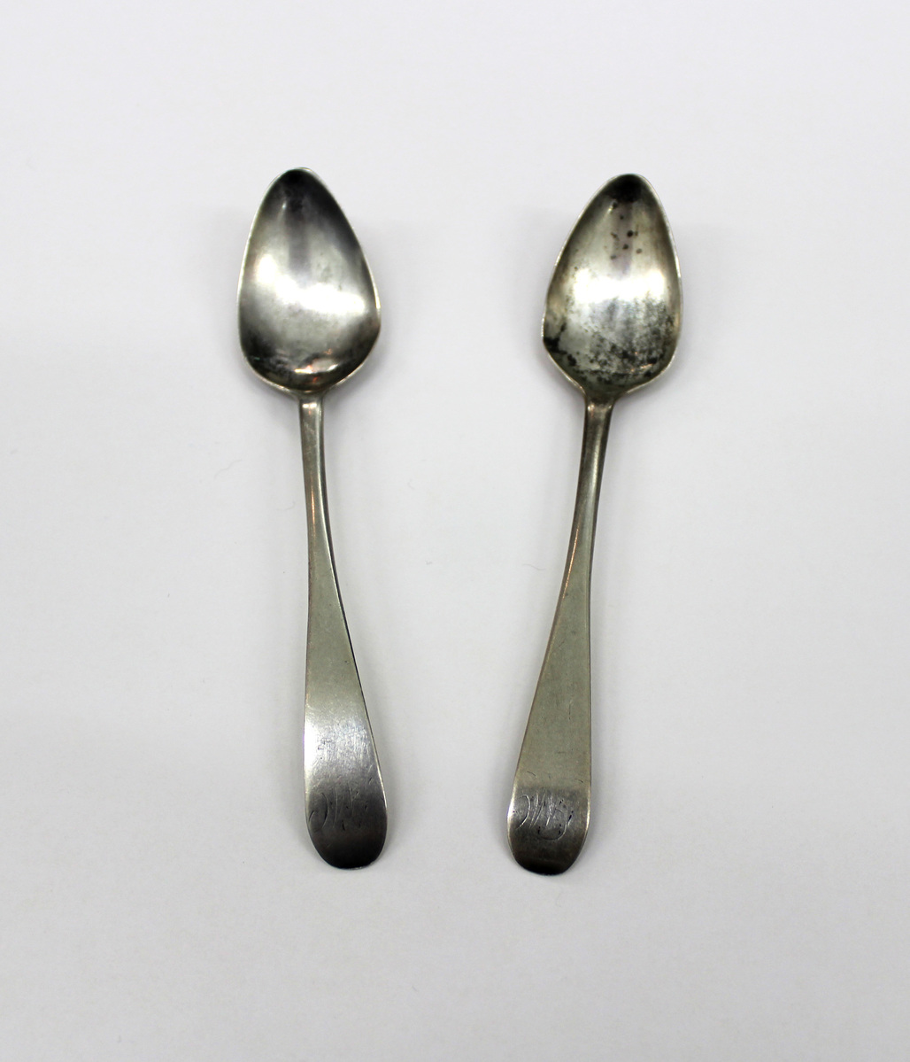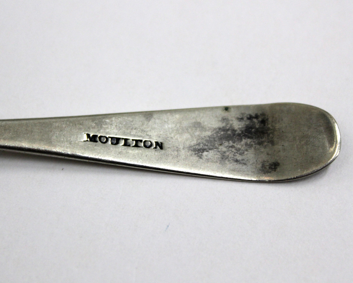 Set of two silver coffee spoons, plain, with "MC" engraved at end in script. Shallow pointed bowl with narrow stem that widens at handle. Rounded terminal, curving downward. Stamped "MOULTON" underneath.
