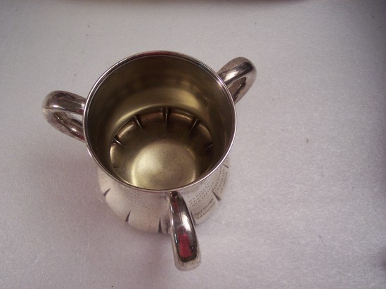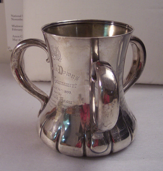 Round cup - lobate base concave sides; round rim - 3 ear shaped handle.Hallmarrk on the bottom "Tiffany & Co./8573 Maerks 1871/Sterling Silver/925/1000" 3 panels with inscription; 1) round shield "Norfolk Downs Country Club/Norfolk Downs Golf Tournament/August 31st 1899/Won by/Norfolk Team/David H. Rowland H. Duncan Bulkey/Chalres A. Joufford Rufus S. Rowland/ Henry Farnum Francis R. Cooley" 2) "Won by/Litchfield Golf Club/August 31st 1900/R. Noble Smith George Richards/R. Maxwell Ingham William A. Tennille Jr./William H. Sanford Frederick H. Fuller/Sept. 5 1904 W.K. Wallbridge R.D. Sanford/S.P. Griffen S. Cunningham/Wm. H. Sanford D.G. Ambler/Sept. 7th 1905/ Alex Baldwin F.H. Fuller S. Cunningham/W.H. Sanford S.P. Griffin D.G. Ambler 3) "Won by/Litchfield Club/September 7th, 1901/ George Richards H.C. Mac Lean/ Wm. K. Wallbridge S. Cunningham/Chas. A. Lindley/Wm. C. Beecher/August 22nd 1902/Wm. K. Wallbridge E.H. Coy H. Green/Geo. Richards Chas. A. Lindley H.C. Maclean"