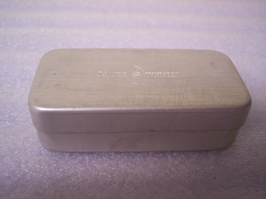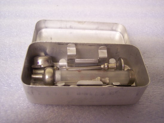 Rectangular metal case with rounded corners - lid lifts off. Stamped on top of lid "Original Record" Inside lid is small syringe with accessories