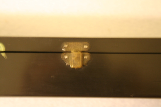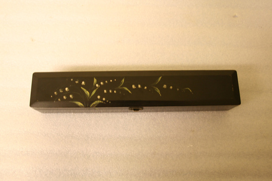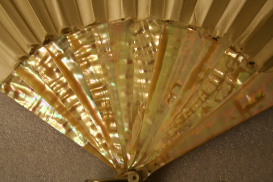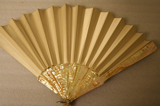 A: Fan - Fan with mother of pearl stretchers. Fabric is cream colored silk lined with paper. Fan is held together with silver metal loop. B: Fan Box - Black lacquered wood fan box, magenta pink silk lining, metal clasp and hinges. Lilies of the valley painted on top of case in green and white paint