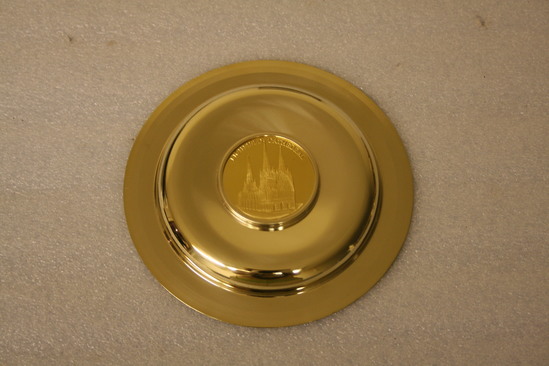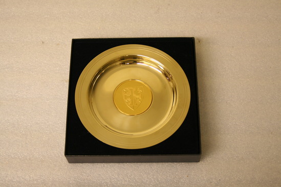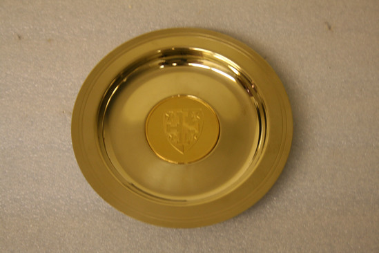 Silver plated plate with arms of Litchfield Cathedral on front and a view of Cathedral on back