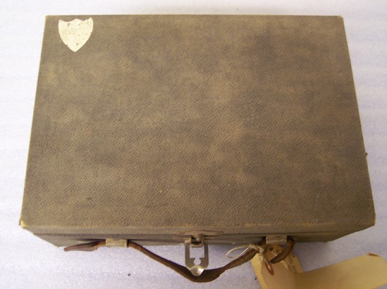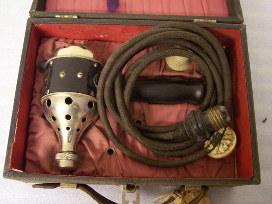Black case with leather handle with pink cloth lining containing a vibrator. Directions for use in a separate book Metal label on vibrator "White Cross Electric Vibrator, etc" Purple label under cover with same saying.
