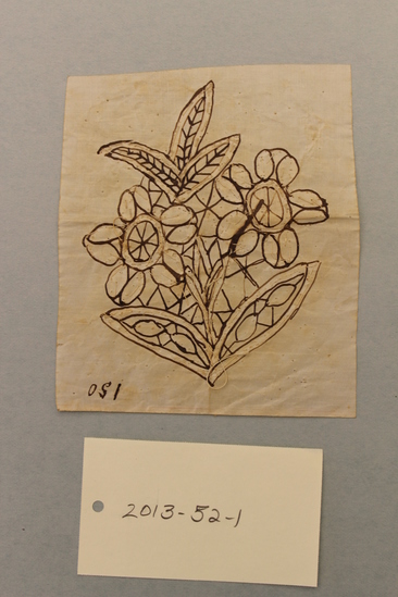 Square piece of ivory parchment with a waxy finish. Honiton lace, flower and leaf arrangement drawn on one side in black ink. On the reserve the lace has been worked in ivory cotton thread. The lace is unfinished. Written in ink in one corner is "150."