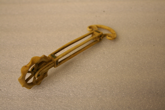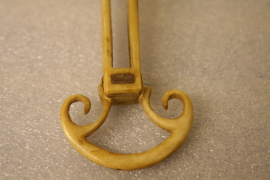 One end with crimped wheel between two posts at end of shaft with three ring turnings in center, the other end flares to half moon with triangular crimped end. Carved out of the tooth of shark.