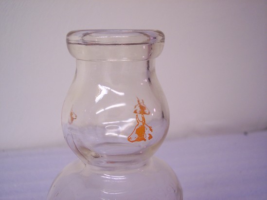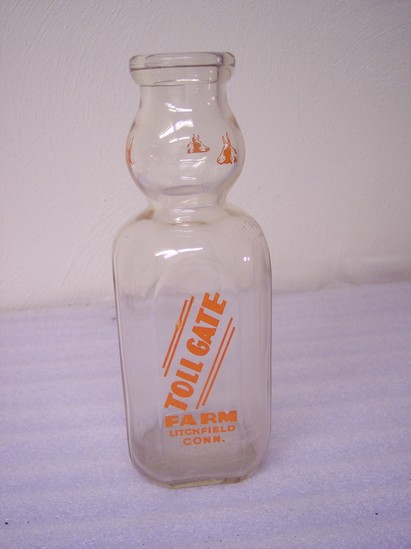 Square shaped bottle with round neck. Printed on one side in orange lettering "Toll Gate/Farm/Litchfield/Conn" Three cow heads printed in orange on neck of bottle