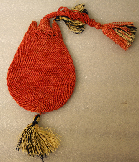 Small purse made out of crocheted red silk Semi-circular or egg shaped body. There is a single handle extending from top of purse of twisted red silk. The handle ends in a tassel of red, black and yellow silk thread. There are two other tassels of yellow and black thread - one at the bottom of the purse and one at the base of the handle.