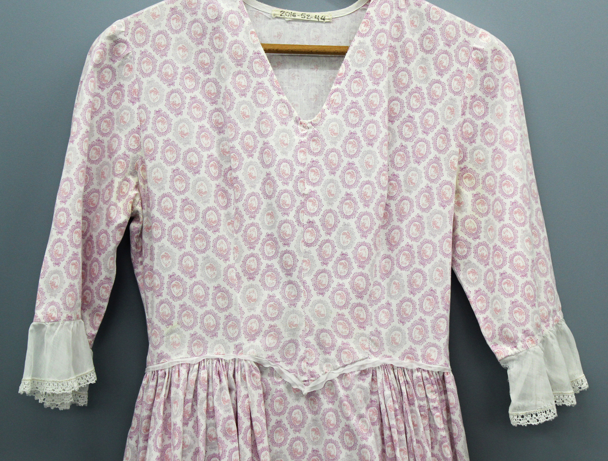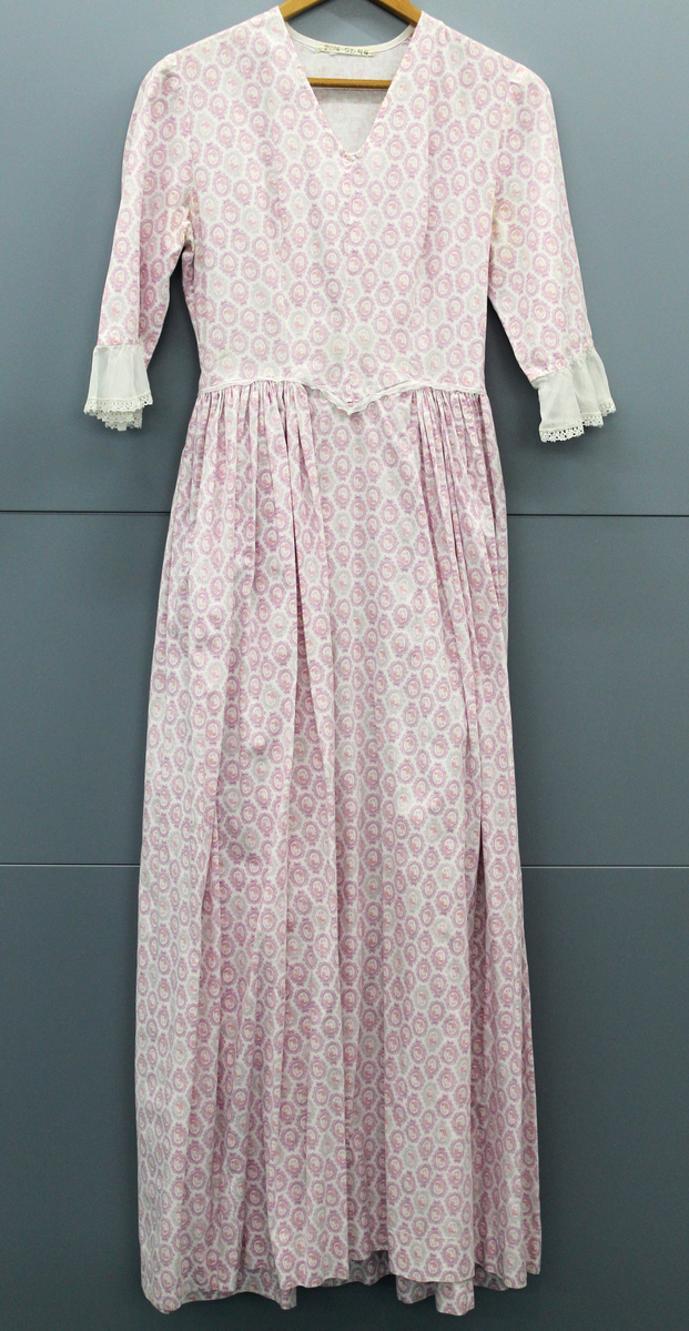 Lavender cotton dress with printed cameos, done in an eighteenth-century style. Fitted bodice with V'd center front and V-neck. Three-quarter-length sleeves with sheer white cotton ruffle with lace edge. Long gathered skirt with metal zipper at left-side seam. White hem seam binding.
