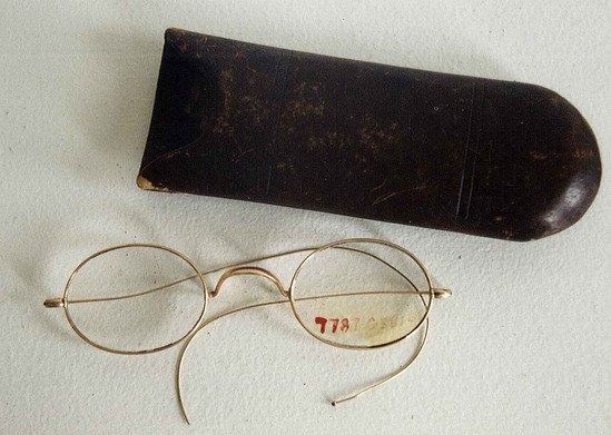 Eyeglasses 1958-22-1A. Gold with hump bridge, oval frames with glass lenses, bent wire earpieces with ball ends, (one missing), contained in a brown leather hard slip case, 1958-22-1B