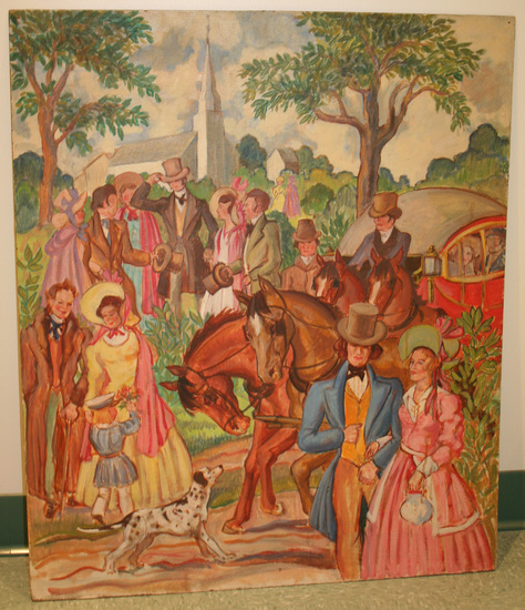Oil on board - scene of Lyman Beecher's Church with Female Academy and Law School students and townspeople in the foreground. The church is elevated in the background - white with a steeple. There is a red carriage on the right hand side pulled by two horses. Students mingle around scene. Clothing is not historically accurate - a more colonial revival portrait of the Litchfield past. There is a key to this picture identifying who each of the people are in the painting. The key is a rough sketch of the mural on paper, framed under glass.