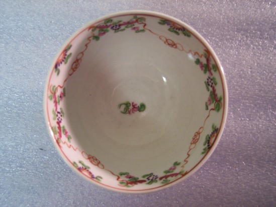 Tea bowl is decorated with garlands of flowers in polychrome and is overglazed. No handles. Has single, small flower at the base on the interior.