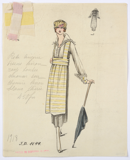 Lithograph and watercolor on paper fashion design. Linen dress available in all shades over a white pleated linen chemise. Fabric samples accompany rendering.