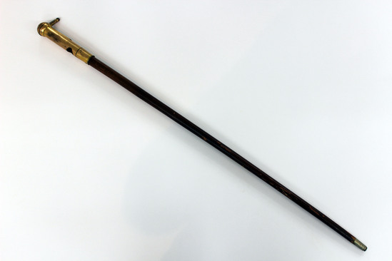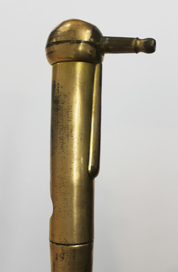35 ¼" long, 1 ¼" stepped metal tip, round reddish wood shaft to brass plated top of 1 ½" band with name plate: H. WALDSTEIN'S/PATENT/41 UNION SQUARE N.Y. quarter circle knotches corners and nailed on, 5" revolving top with eyeball shaped opening that slides over brass inner pipe with similar opening. Cats two part flattened sphere top with 1 ¼" nippled nozzle extension. Tapered 'wattle' hanging from bottom of sphere under nozzle. For liquids (?)