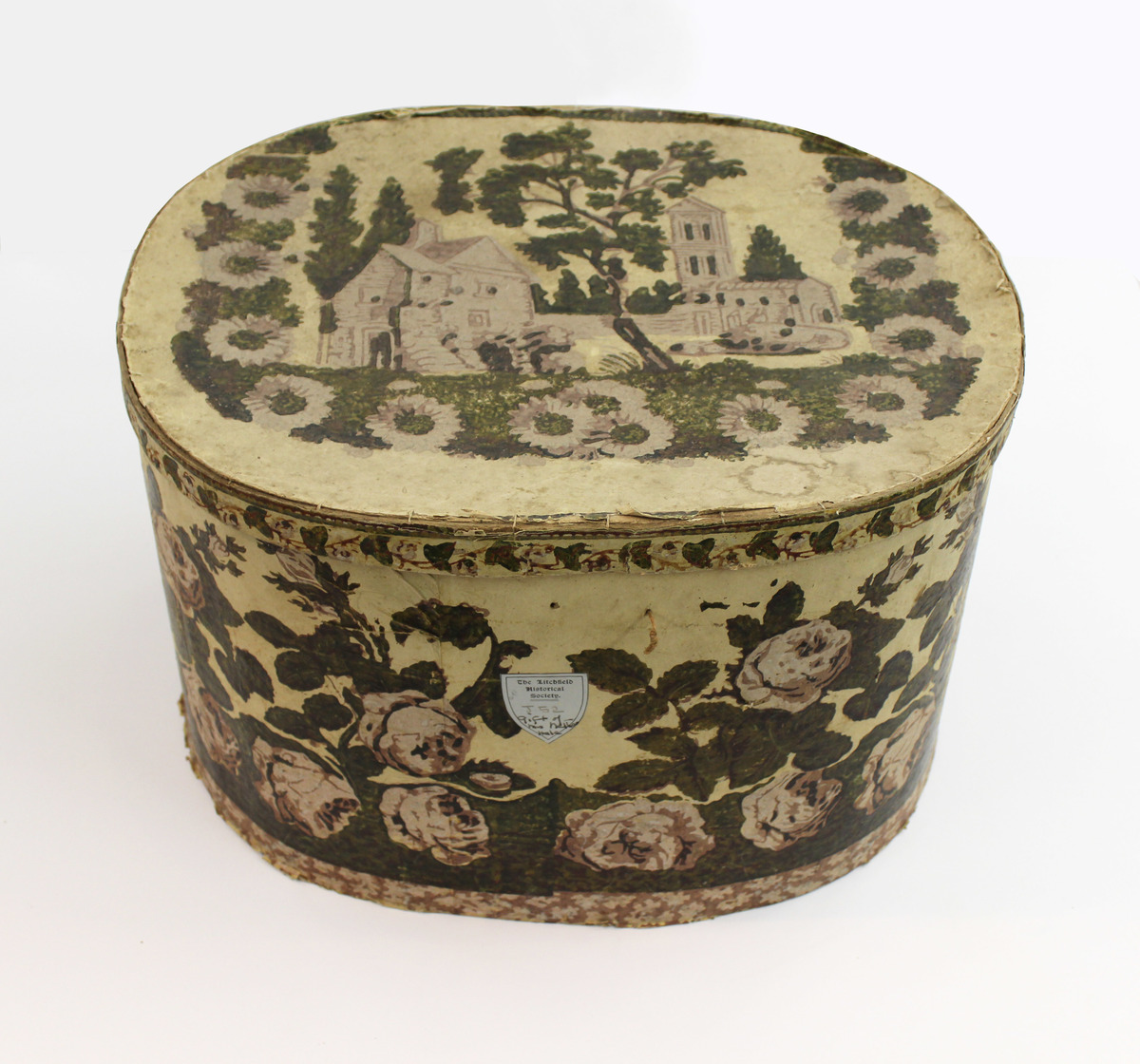 Round board box covered in printed wallpaper or paper. Pattern of pink roses and green leaves around bottom section, with a pink border with white floral motif around base. On the lid is an image of two buildings with trees, surrounded by a border of pink flowers and foliage. On the rim lid is a vine pattern with white flowers. Box is sewn together.
