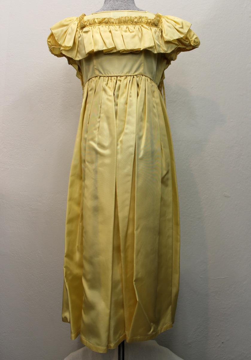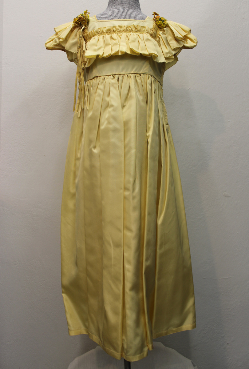 Yellow silk long flower girl's dress. Square neckline front and back. Ruffle around shoulders and bodice. Short puff sleeves. Clusters of yellow artificial floral corsages at sides of front neckline with ribbons hanging from flowers on left. side. Full gathered skirt with piping at waist. Horse hair braid at hemline. Side zipper. Label: CUSTOM MADE BY / CARADELE/ NEW YORK.