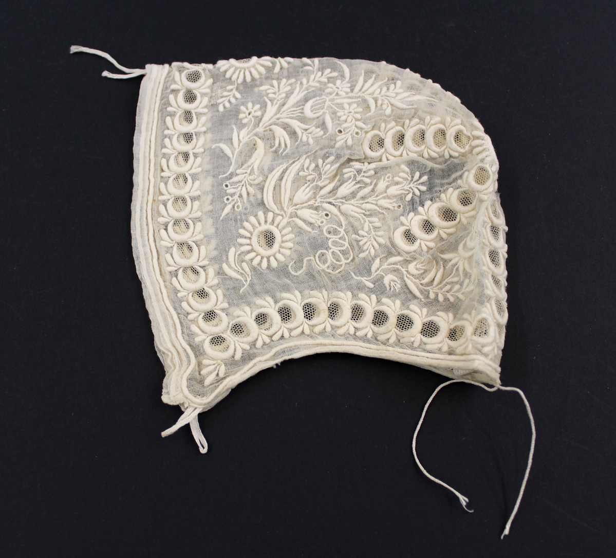 Off-white sheer cotton child's bonnet; white work floral embroidery with net fillings; piping along front and neck; circular design with radiating bands at center back; cotton braid loops on both sides; drawstrings at center back neck and top