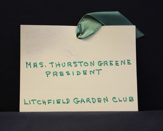 Nametag of yellow paper. Hole punched at upper center with green satin-faced ribbon laced through and stapled in place. Written in green marker on the card is, "MRS. THURSTON GREENE/ PRESIDENT/ LITCHFIELD GARDEN CLUB."