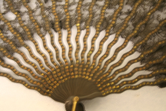 Black lace fan with wavy ebonized wood sticks which are decorated with gilt rosettes. Brass ring at bottom of sticks. Lace is done in floral pattern with scalloped edge at top.