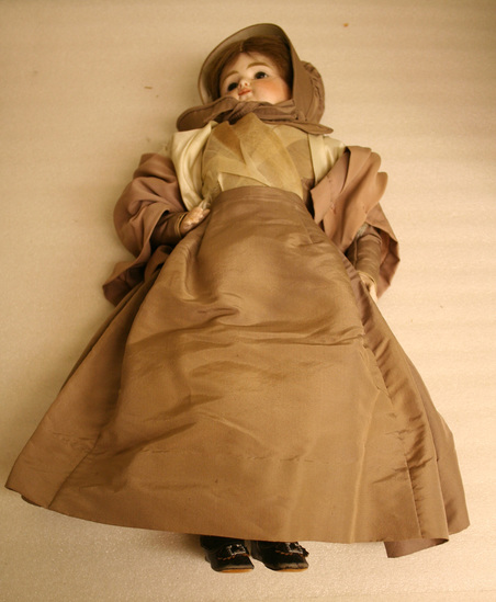 The doll has a porcelain head and hands, a jointed body of leather. Her face is painted. She has brown inset glass eyes and human hair. She is dressed in a full skirt of pale lavendar silk, 2 cotton and one wool petticoat and panties. There is a bodice and stiff bonnet of same material. Crossed over bodice is a white muslin kerchief and she has a white silk shawl and a larger light lavendar one. She wears black stockings and leather shoes.