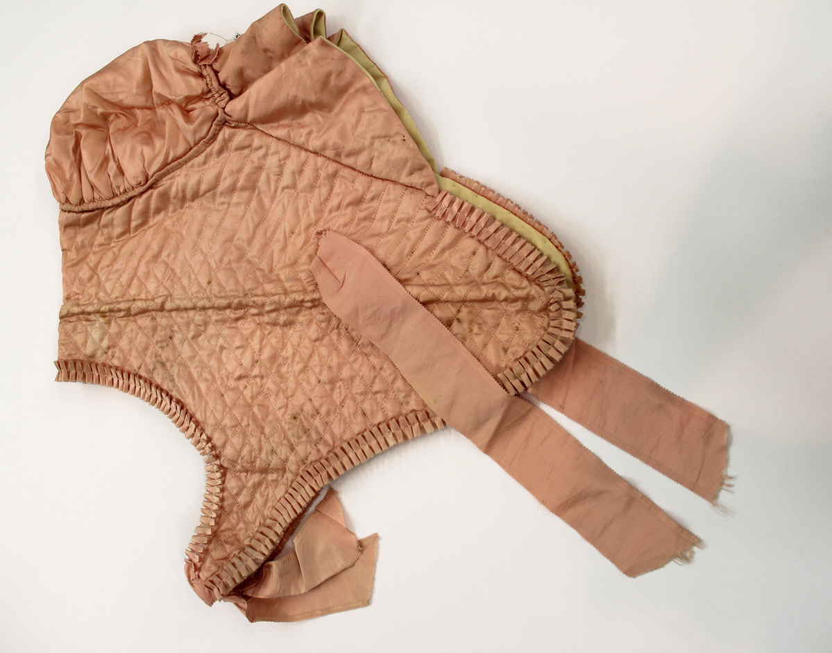 Pink quilted silk women's bonnet/hood; pleated ruffle around front and side edges; gathered section at center back; pink silk ribbon bow at center back; pink silk ribbons at front under neck and at sides; lined with off-white wool