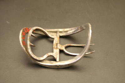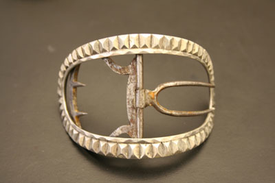 Pair of shoe buckles. Oval shape with rounded body. Buckles formed in a mold. Front of buckles decorated with repeating molded design of raised squares with X in each square. Center rod with two tonges. One is U shaped with pointed ends. Other tongue is larger with rounded corners. Two small prongs pointing back towards center rod.