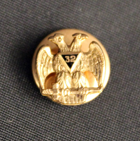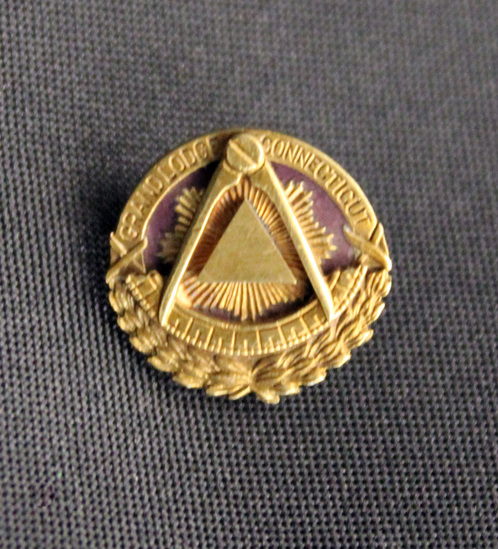 Gold Masonic lapel pin. Circular seal with "GRAND LODGE CONNECTICUT" stamped around top edge. Laurel swag around bottom edge. Center decorated with compass, ruler and triangle over rays of light. Gold Masonic lapel pin. Double-headed eagle with spread wings perched on branch. Black triangle on eagle's breast with "32" in gold. Gold Masonic lapel pin. Shaped like triangular shield with thick field of white enamel around a blue enamel triangle. "50 YEARS" in gold across top. 'CONNECTICUT" in gold across bottom. Gold compass, corner ruler and "G" in gold on blue enamel triangle. Small green cardboard box with lid for holding Masonic lapel pins. Box filled with white wool batting.