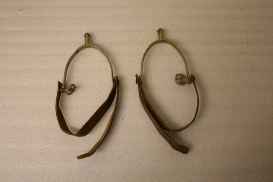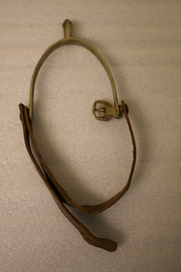 U shaped piece of meatl with projection on round end. Attached to leather strap which fits around foot. Another, adjustable strap fits under foot