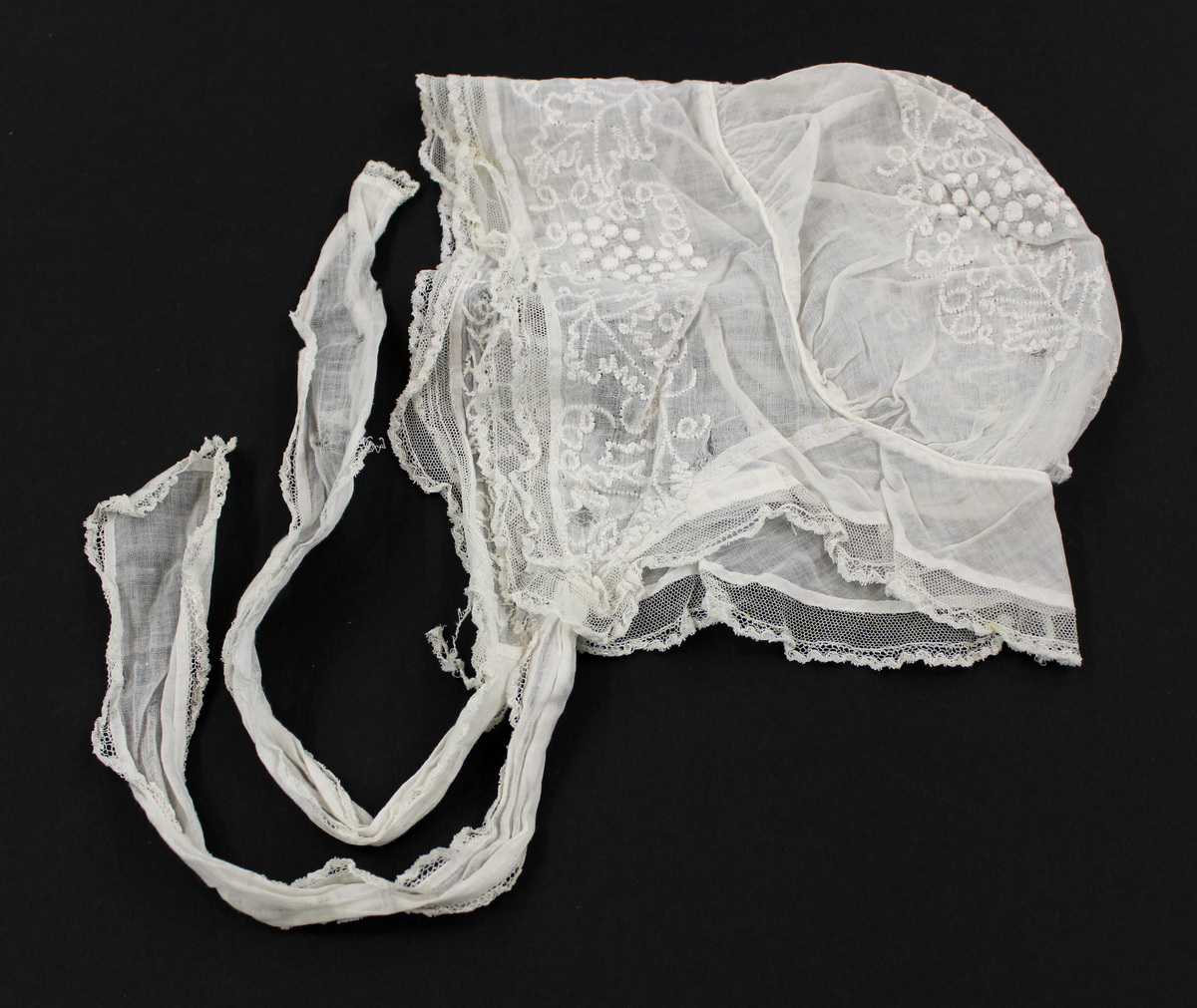 White sheer cotton child's bonnet; grapes motif embroidery; double lace ruffle around front; gathered back section; piping at seams; fabric ties with lace edges