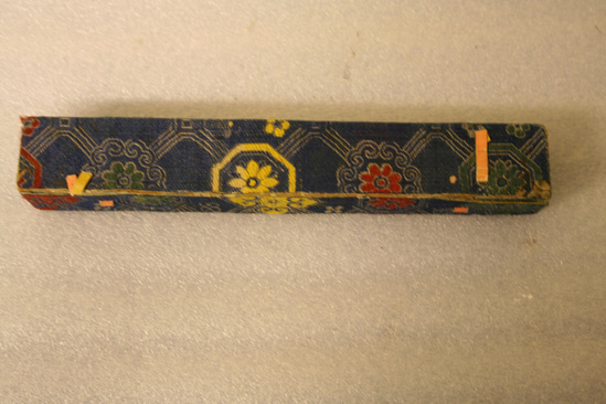 Cardboard fan box covered in blue brocade silk with geometric design on fabric in blue and red. Box lined with salmon colored paper.