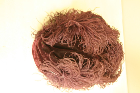 Plum colored velvet hat; long oval shaped with two ostrich feathers beginning in the front along each side; the feathers are also plum; black silk interior