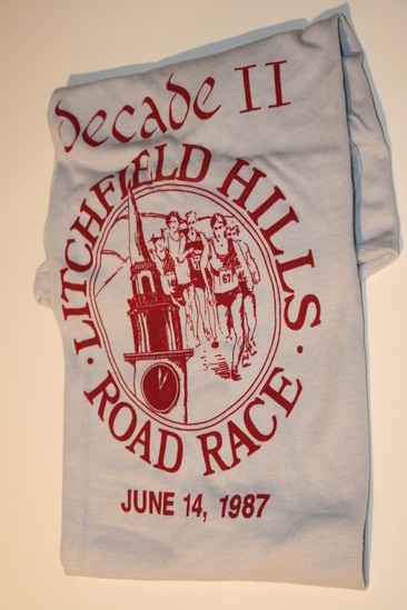 Gray short sleeved t-shirt. Logo on front center of shirt, printed in red. Circle logo with runners and steeple or clock tower. "Litchfield Hills Road Race" printed around outer edge of logo. "Decade II" printed above logo. "June 14, 1987" printed below logo.
