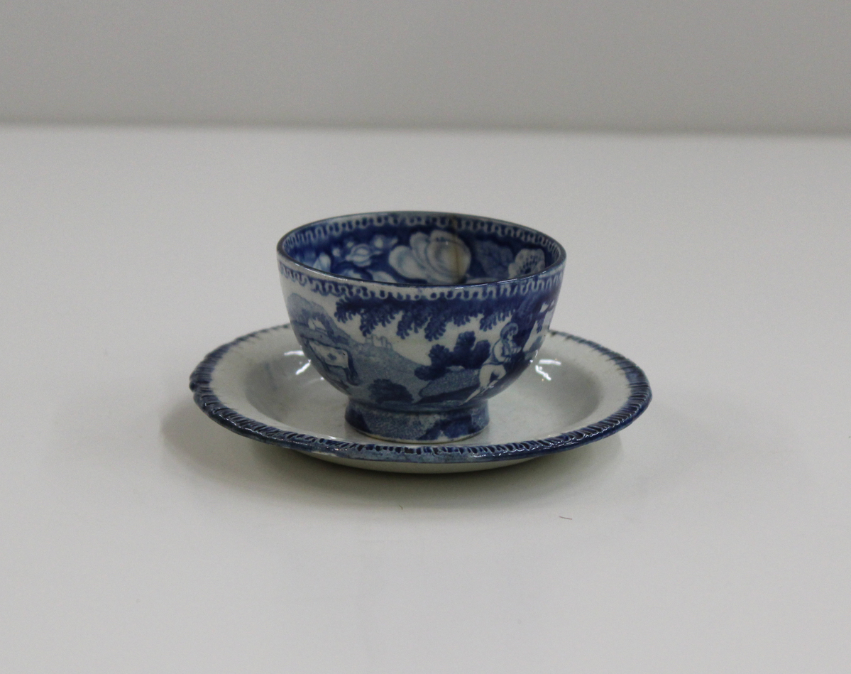 Glazed earthenware teacup and saucer, used as a toy or play teaware. A - Off-white ceramic saucer or dish with incised lines forming decoration around rim and narrow line of blue glaze around edge. Donated as companion to 2016-52-23b. B - Off-white ceramic, handleless tea cup with extensive blue transfer-printed decoration. Exterior of the cup has an agrarian scene with a milkmaid, shepherd, and their animals under the shade of a tree with a farmhouse in the distance; decoration extends down the foot of the teacup. Interior has a floral motif around the rim with a small image of the farmhouse at the center of the bowl. Donated as companion to 2016-52-23a.