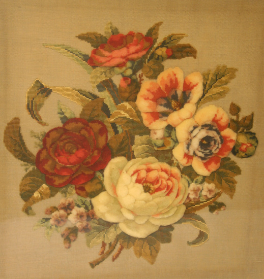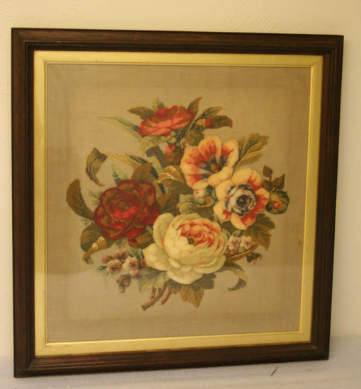 Turkey work of large roses worked on a fine cotton canvas. The leaves are petit point and the flowers are done in raised wool (or turkey work) Much of the background is the canvas. Framed in walnut with a gold liner. The canvas is backed with linen. Framed under glass.