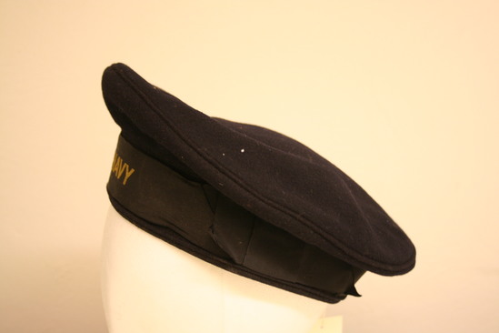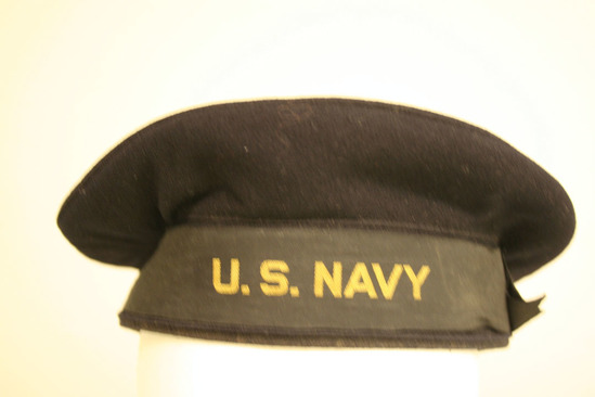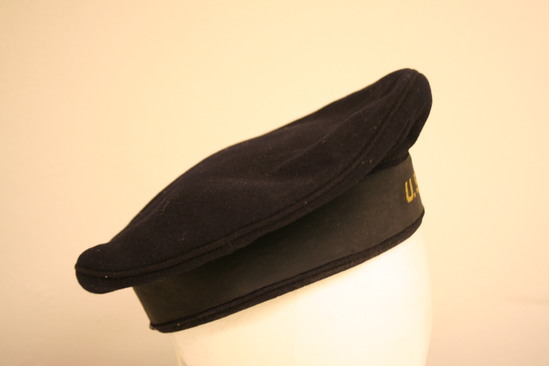Dark blue wool cap; straight sides with wide flat top (wider at base); dark blue ribbon around base of cap with "U.S. NAVY" embroidered in gold in front and knotted, flat "bow" on right side (when facing hat); light brown band on inside and dark brown diamond patch on inside