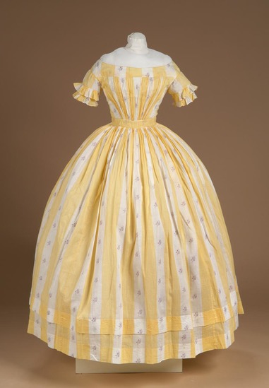 Dress of printed cotton; repeating design of solid yellow vertical stripe and white stripe with purple and red flowers; off the shoulder neckline; short sleeves trimmed with two rows of pleats; front of dress gathered at angles from a wide corded waist band; plain back fastened with hooks and eyes; full skirt (bell shaped) gathered at waist and has two hems