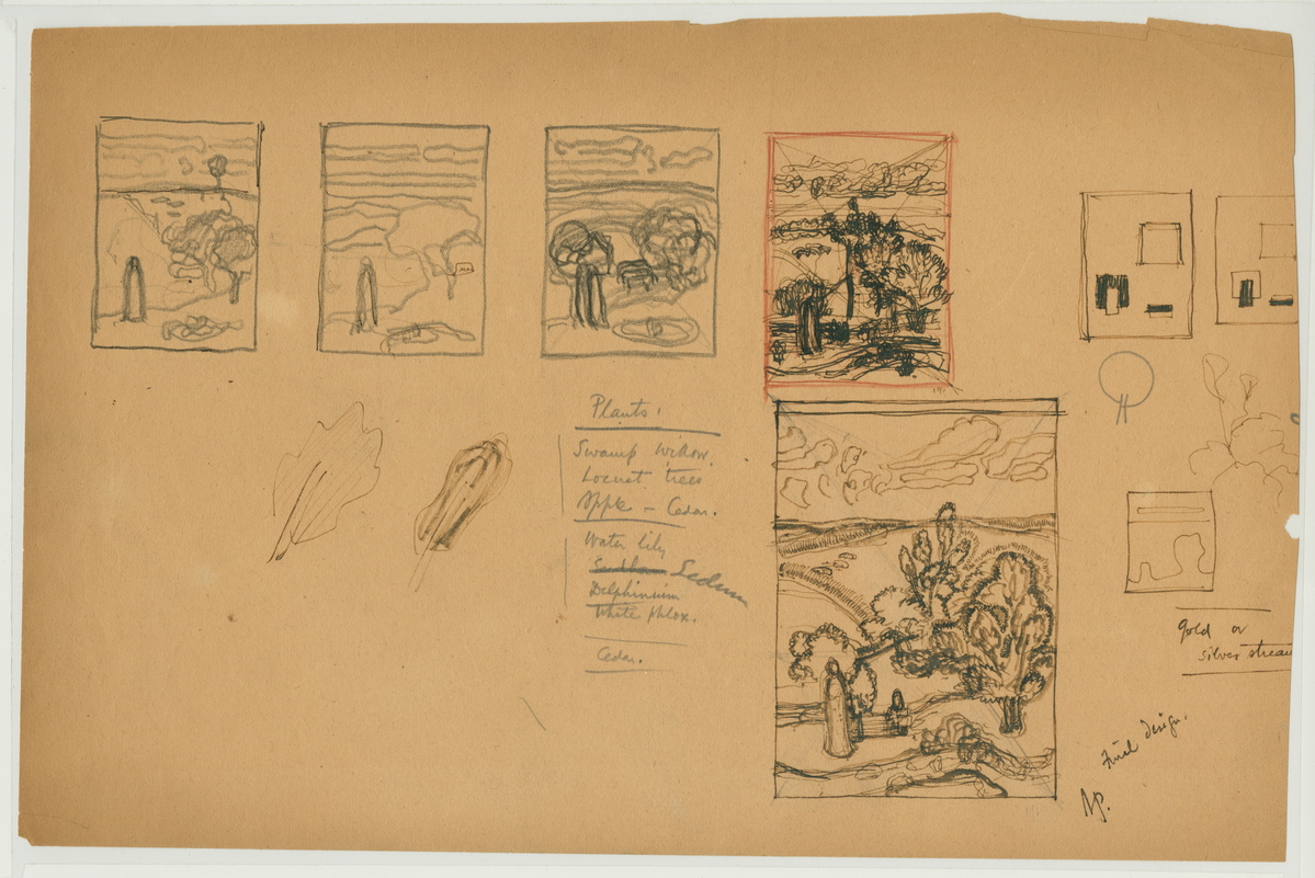 Three pencil sketches and two pen and ink sketches on paper of a landscape in various rough stages. Includes paint list in ink in bottom right hand corner labeled: "gold or/silver stream/Final Decision." Also includes list of plants in pencil in the center of the paper:"Plants/Swamp Willow/Locust Tree/Maple-Cedar/Water Lily/Sedum/Delphinium/White Melox/Cedar." Initialed, no date.