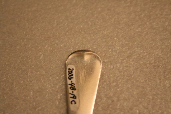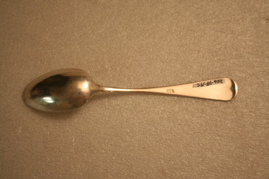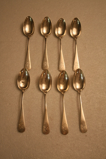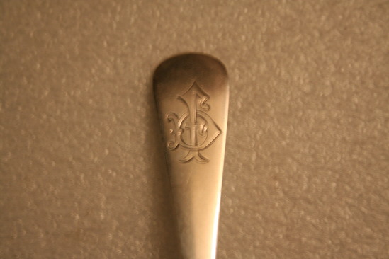 8 silver teaspoons, oval shaped bowl, on front of handle at end "FD" monogrammed letters overlap and interlock. Maker's mark on back - 3 symbols with "STERLING" underneath. Back side of spoon has small raised divet at end