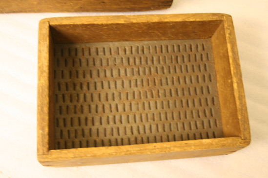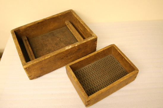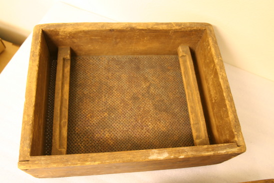 Two rectangular wooden boxes. The smaller one sits inside the larger. The bottom or larger box has two wooden bars above the bottom to elevate the top so that it does not rest against the bottom of the larger box. The bottom of the smaller box has a tin plate nailed to it with fifteen rows of holes punched into tin to create the sieve or strainer.