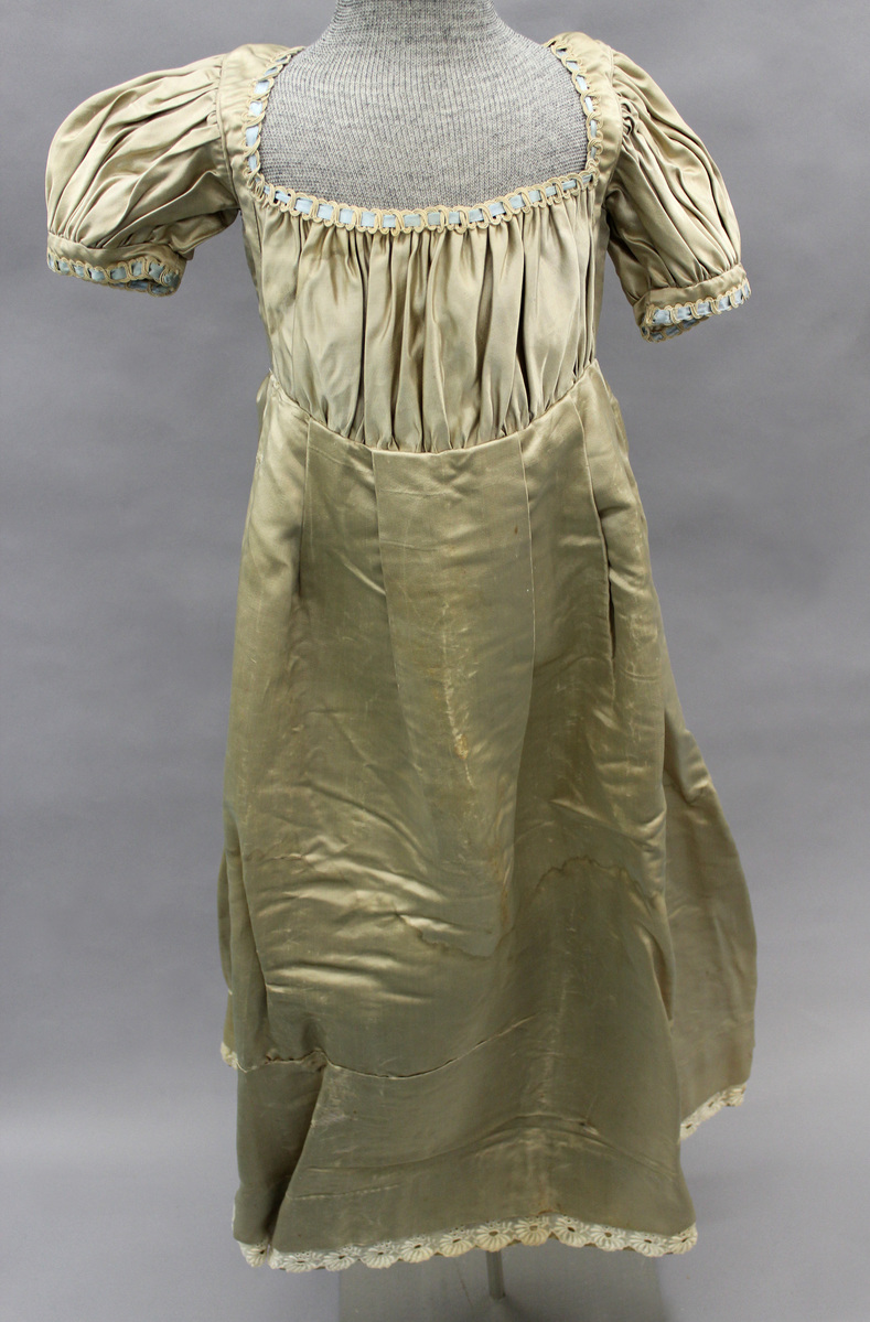 Tan satin child's dress; short puff sleeves; square neckline; gathered front bodice; pleats at skirt front and back; white eyelet embroidery at hem; piping around armholes; blue satin ribbon woven at neckline and sleeves; center back opening with hook and eye closure and blue satin ribbon tie