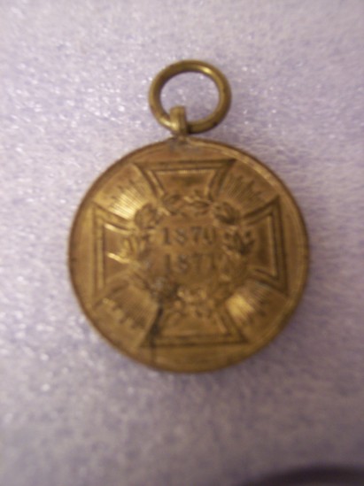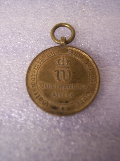 Victory medal of Franco-Prussian War, 1870-1871. Smooth rimmed bronze medal with stepped edges, loop at top. Obverse side has center image of crown over initial "W", legend "DEM SIEGREICHEN/HEERE" Around outside is printed "GOTT WAR MIT UNS IHM SET DIE THRE" On back side laurel wreathed Maltese Cross with rays in background, "1870-1871" in center.