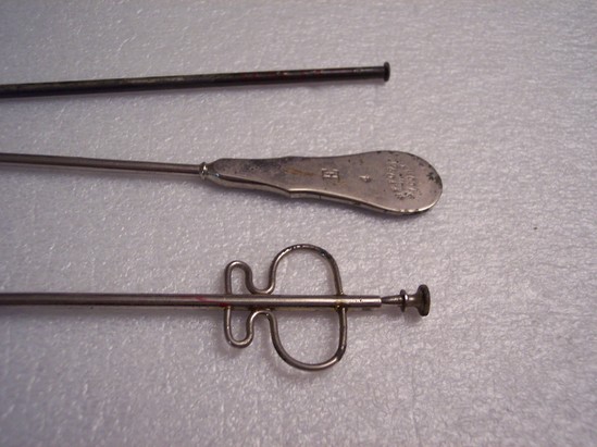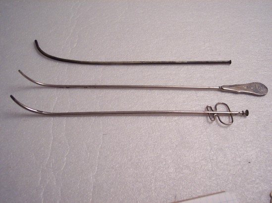 a - 11 1/2" catheter shaped end having "E/4/W.F. Ford/S.I.CO.NY" impressed on handle b -10" long with wire handle and flat top, 12 impressed on end and W.F. FORD/SICONY" impressed on barrel c - 9 3/4" rusted catheter