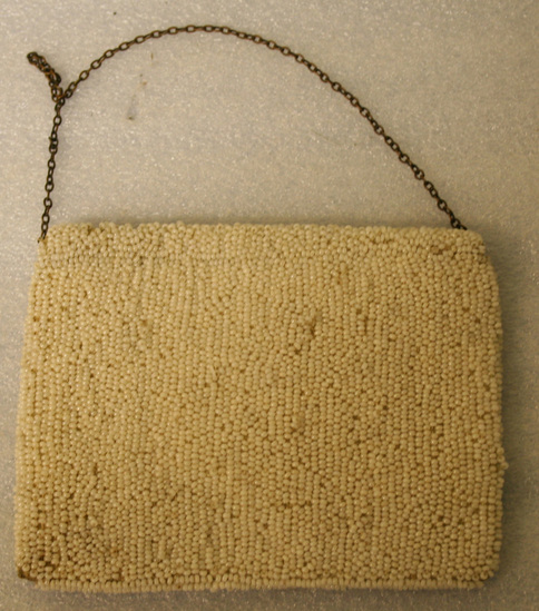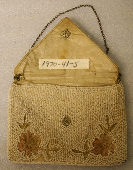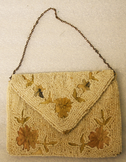 Beaded purse. Rectangular shape with triangular shaped flap on front. Outside covered with white opaque beads. Embroidered pink and yellow flowers on front. Interior lined with white silk. Metal snap closuer. Metal chain link handle.