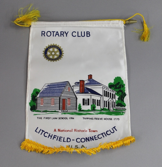 Small banner for the Litchfield Rotary Club. Banner shows the Rotary International logo with a view of the Tapping Reeve House and Law School, against a white background. Text "Litchfield/Morris Rotary Club/The First Law School 1784/Tapping Reeve House 1775/A National Historic Town/Litchfield-Connecticut/U.S.A." Banner has a 1" gold fringe along bottom and gold braided string with tassels along top. Banner is suspended from 9.25" wooden dowel with carved, gold-painted caps.