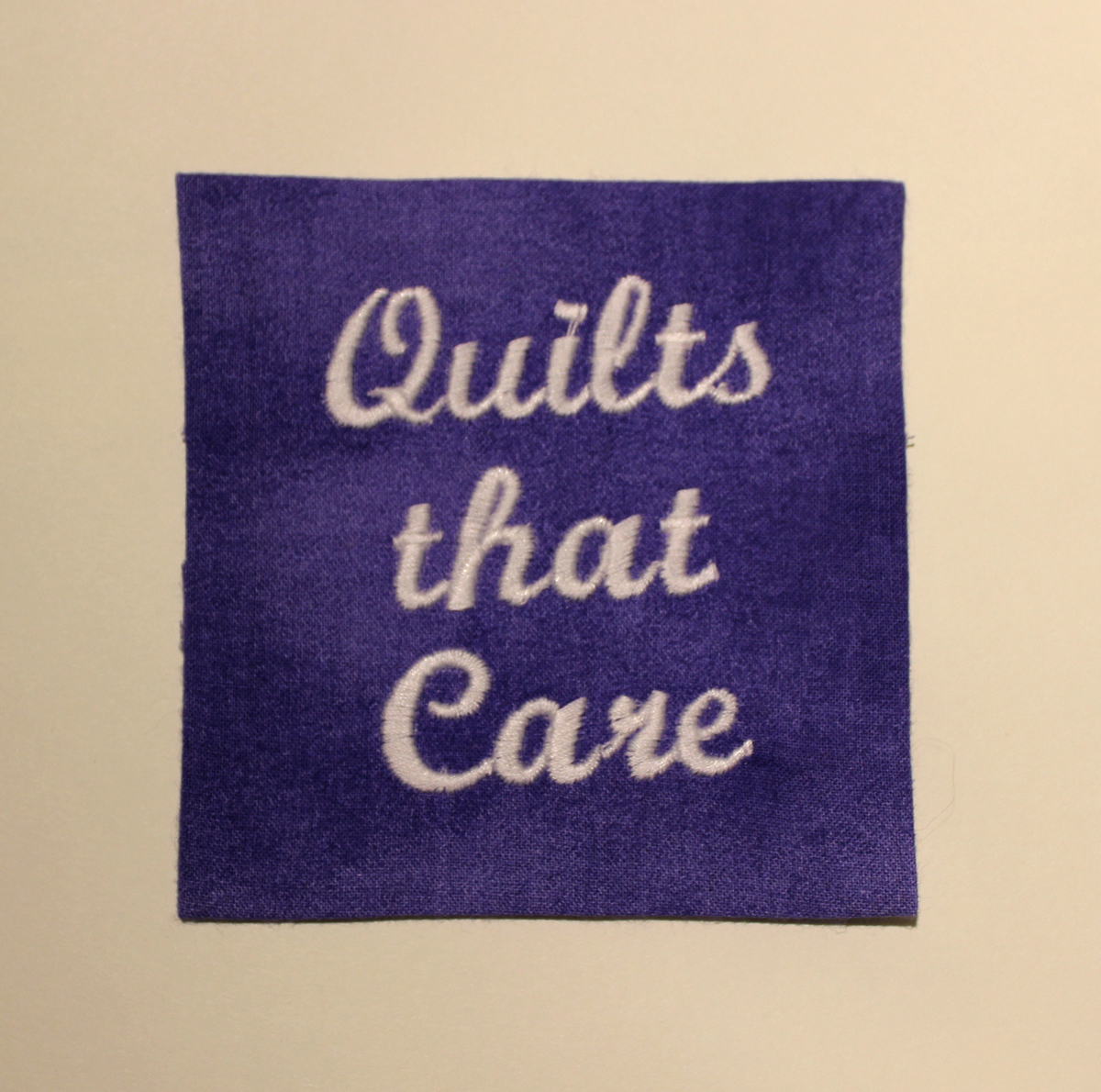 Square patch of light purple fabric; white embroidered letters at center, "Quilts/that/Care" in script font. Edges folded over and finished. Machine stitching and embroidery.