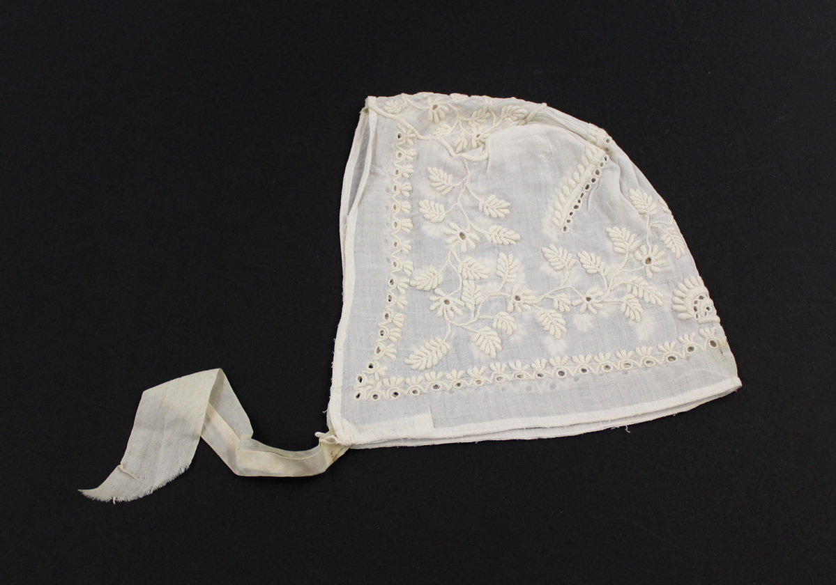 Off-white sheer cotton child's bonnet; overall white work embroidery; fan-shaped section at back; loops at sides; off-white silk ribbon ties (missing one tie)