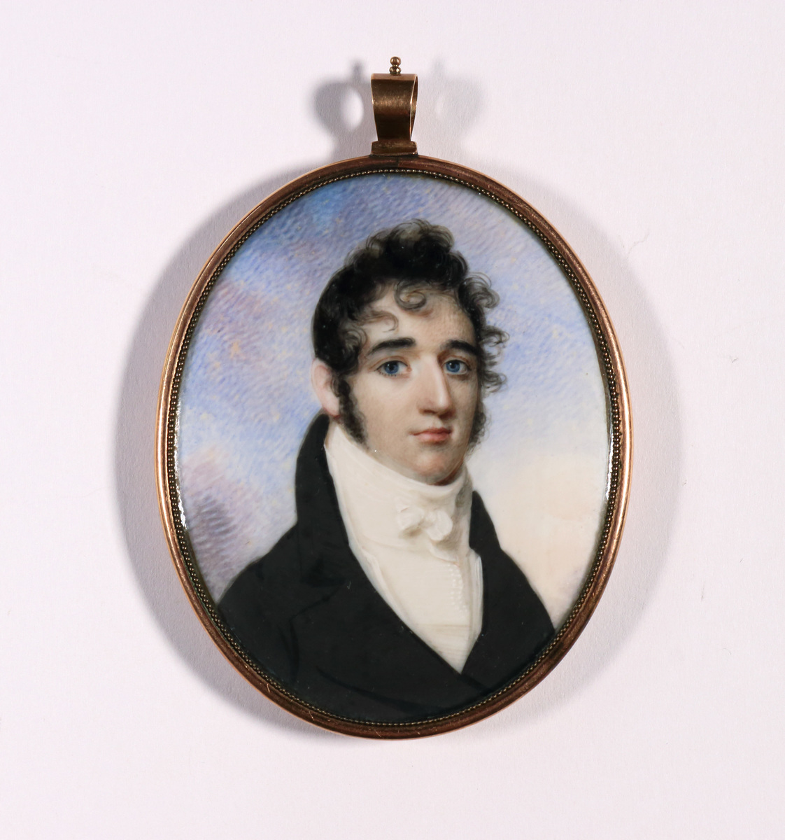 Bust portrait of young man with long, curly black hair, sideburns, and blue eyes. He wears a black coat, high collar, white neck tied with small bow, ruffled shirt. Gold oval frame with glass. Back has small oval area for lock of hair, but there is none. Frederick Augustus Tallmadge (1792-1869) attended Litchfield Law School in 1811. m. Elizabeth Canfield in 1815. Practiced law in NYC. Congressman 1847-49, Sup. of Police 1857-62.