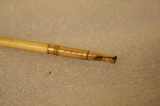 Pen holder for use with a steel quill. Ivory handle with vase turning on the end, rose gold pen holder tip with engine turned design.