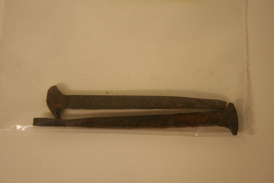 Two iron nails - long straignt body, irregular rectangular shaped heads. Wrapped in paper envelope. Written in ink on outside "Nail from the old/floor in hall '1760'/taken out April 1933"