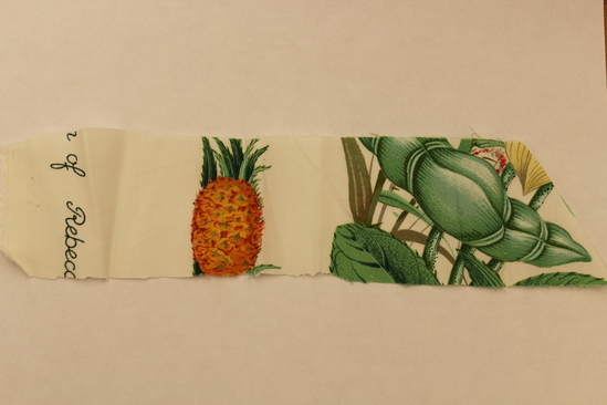 Rectangular fabric swatch made of cotton. White background with a large green leaf print on the right and an orange pineapple with green leaves and green cursive lettering on the left. The lettering reads "...of Rebecca..."